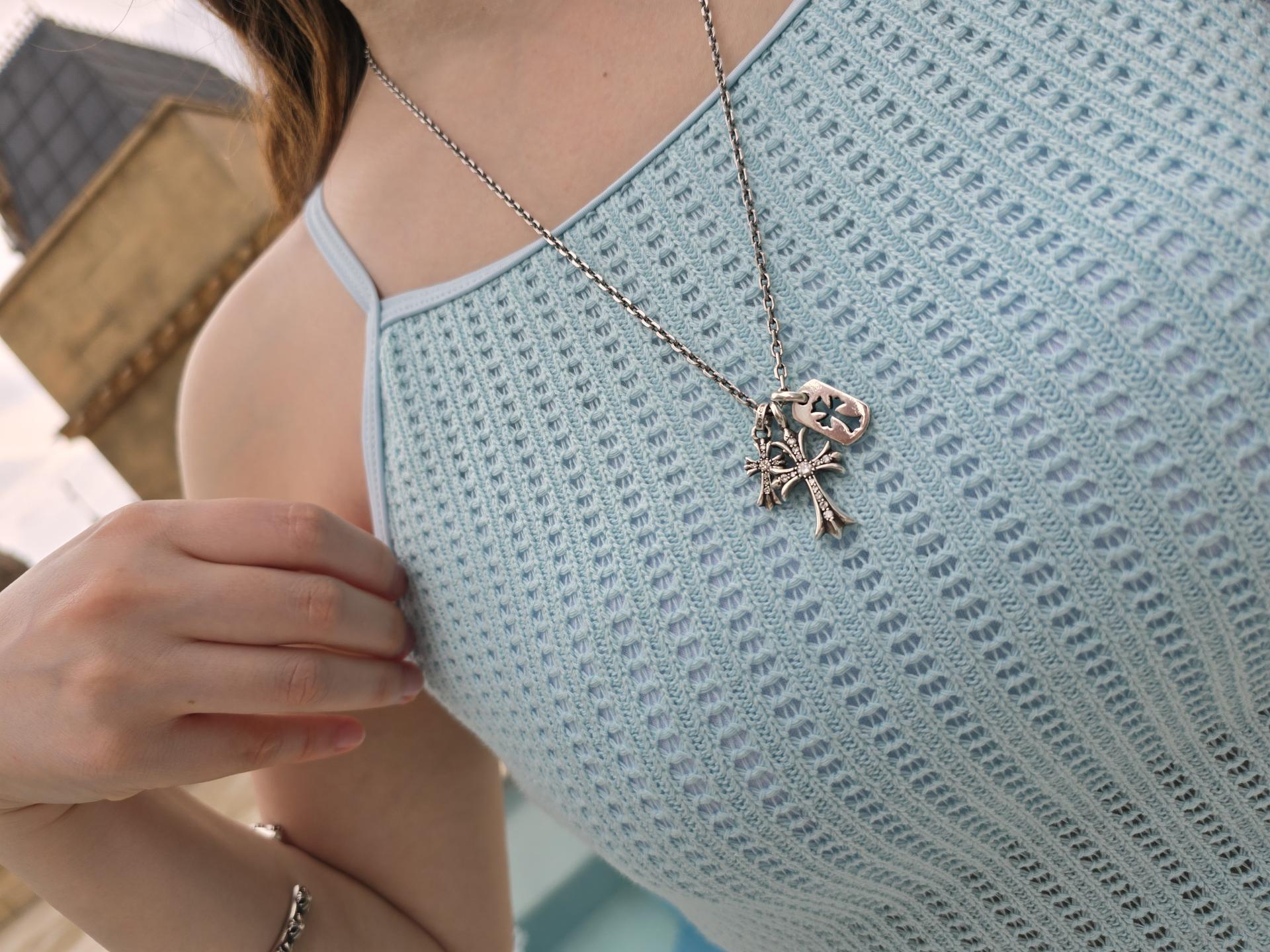 작은 크로스 에 위,아래 크로스가 뻗쳐진 라인따라 크기별로 크롬하츠 만의 특유의 기법으로 정교하게 셋팅 된 작은 예술작품!