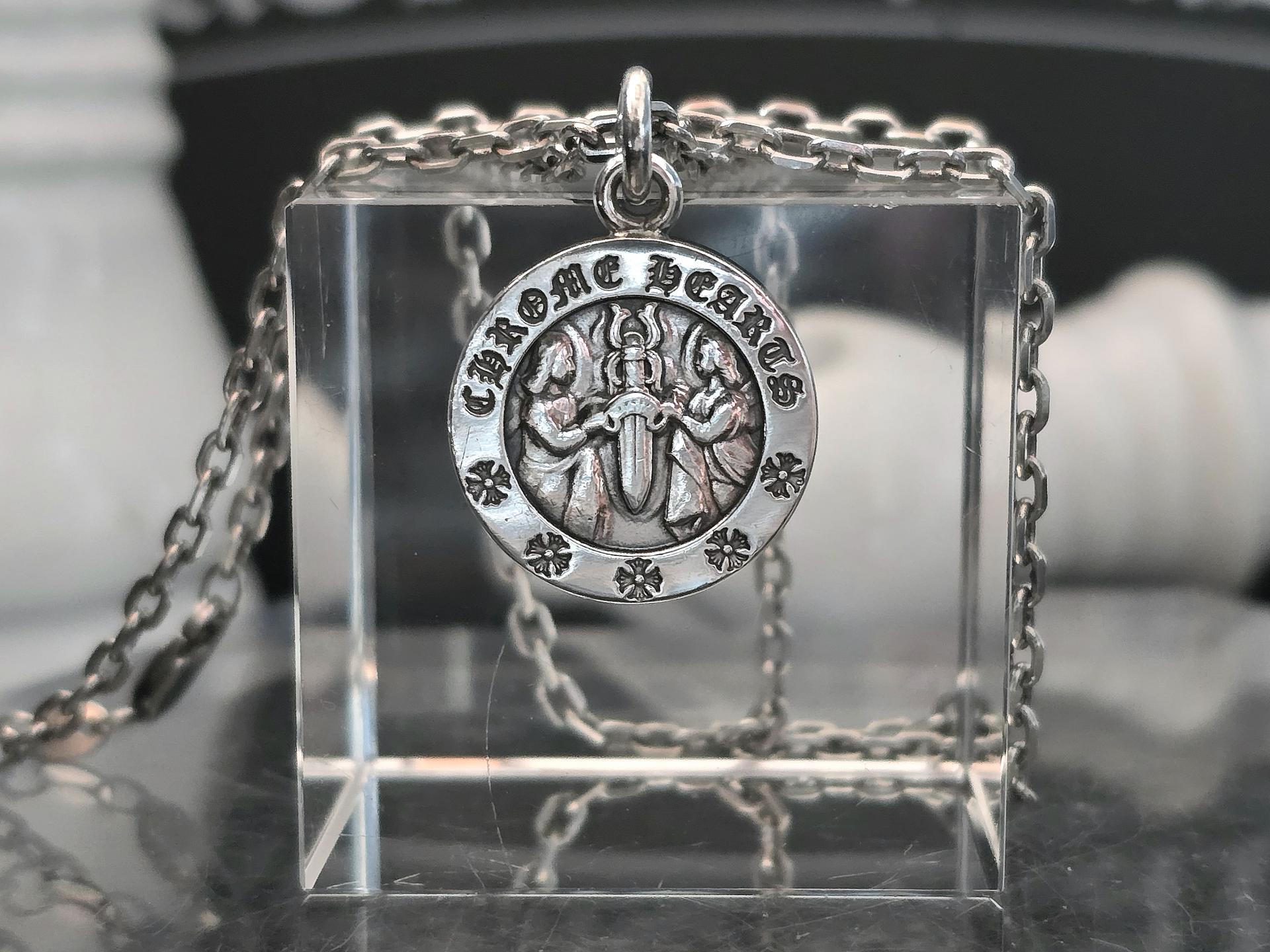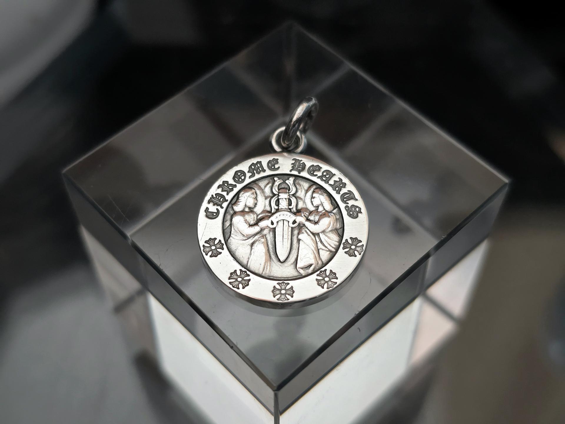 둥근원형 타입 의 메달로써 대거 를 중앙에 두고 천사 두명이 양쪽에 새겨진 크롬하츠 의 이단아 같은 매력을 가진 모델!